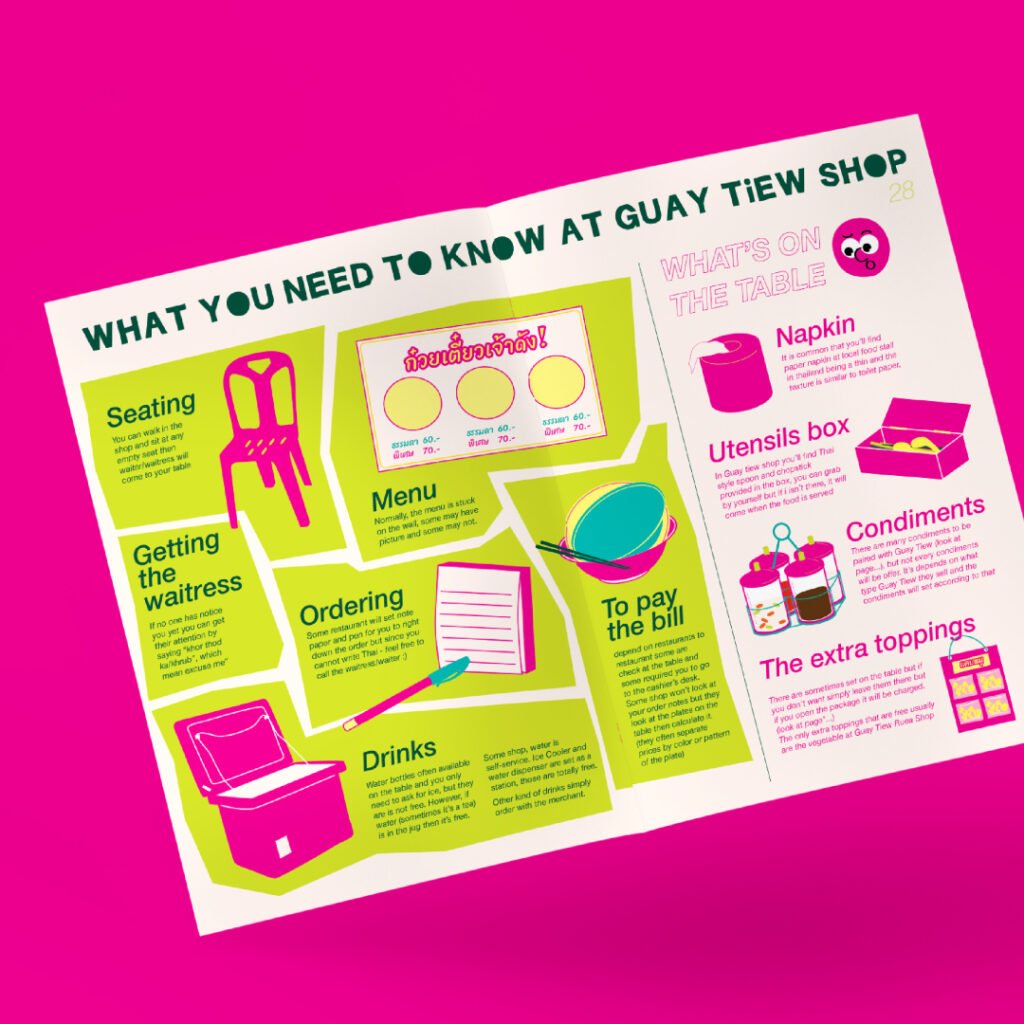“Arai Aroi?” is a campaign consisting of a set of zines and social media, it aims to promote a full experience of Thai style local food stalls eating by introducing ways to order and customize the taste like a Thai. This project focuses on assisting the international students in Thailand, especially Westerners from a cultural difference background. Encouraging and making them familiar with the variety of Thai food customization. Using visual information, infographic, and mini games in the zines together with promoting the campaign via social media.