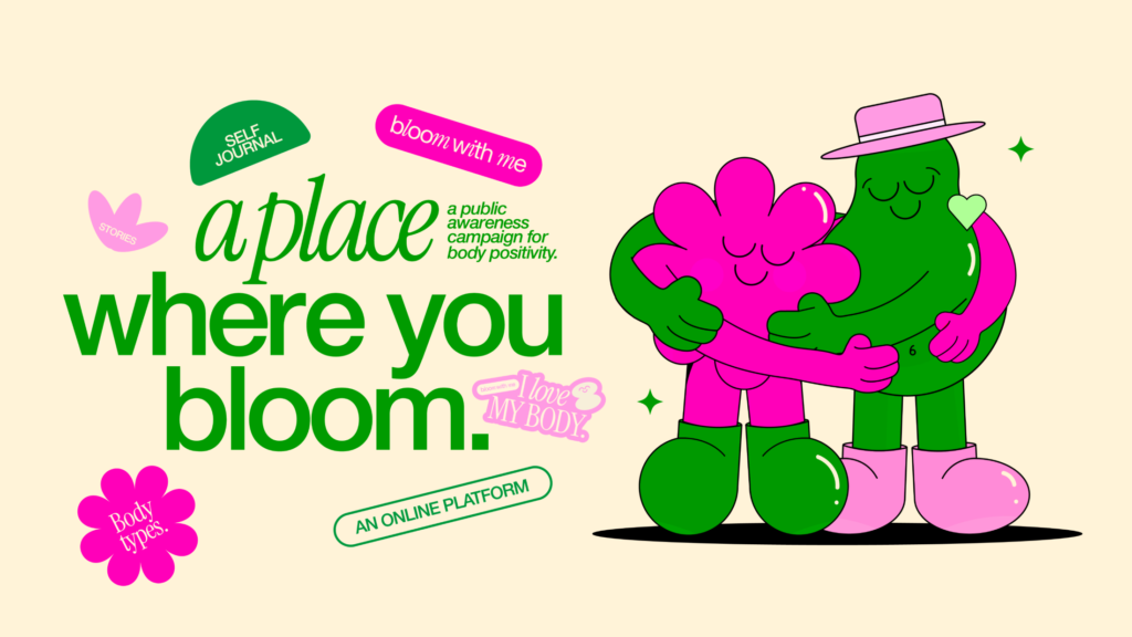 “Bloom with Me” is a public awareness online campaign designed to promote body positivity and self-acceptance for the younger generation regardless of their genders, races, sizes, and/or shapes. This campaign aims to raise awareness by showcasing diverse characters with various body types and sharing their real-life struggles and solutions through positivity encouraging engagement and empathy. Targeting teenagers aged 13 to 19, this campaign mainly focuses on social media to create an empowering online space including a series of Instagram novels that weaves inspiring stories, an online community website for support and connectivity, also a personal journal designed for users to document and share their thoughts with series of daily inspirations.