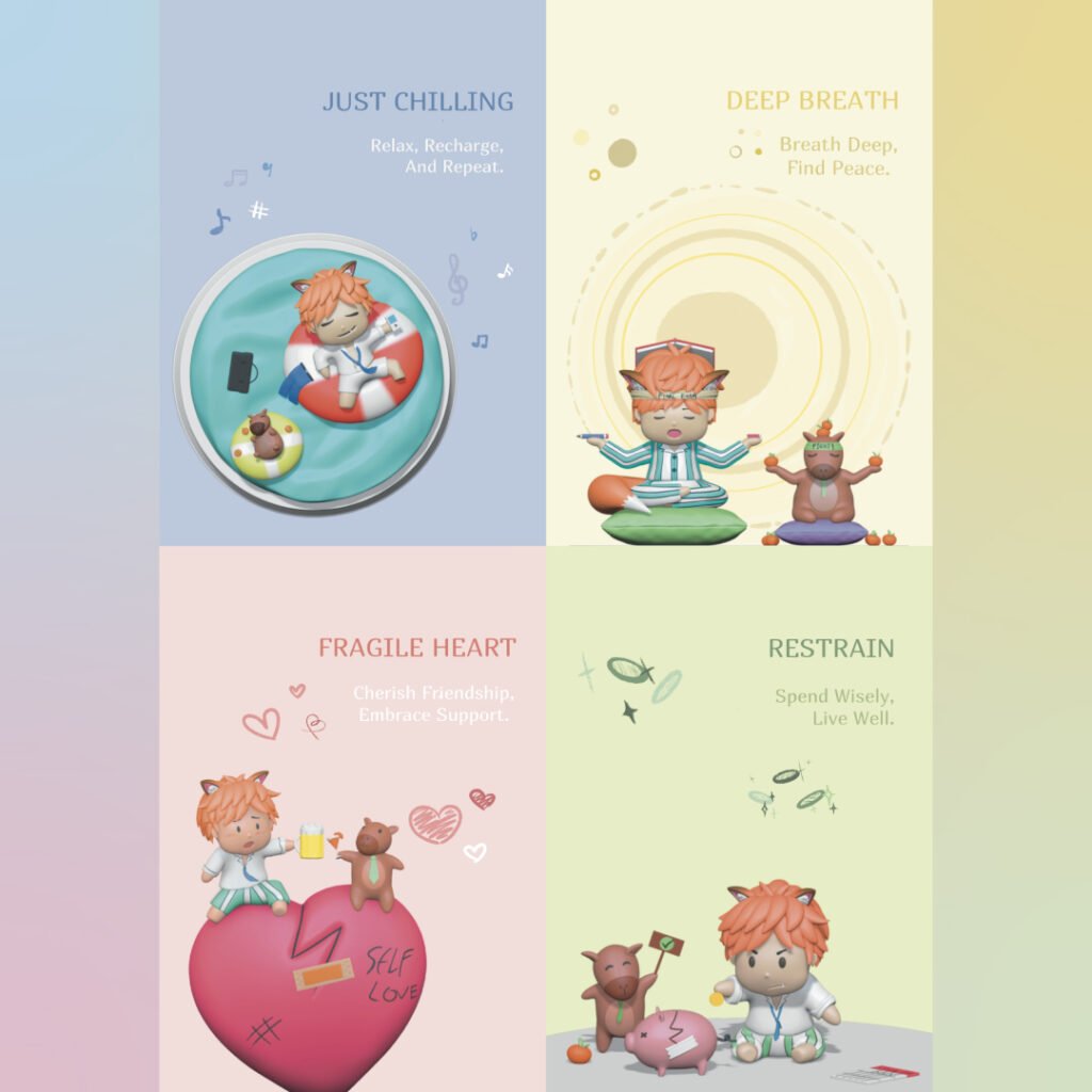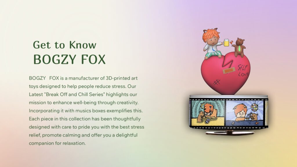 “Break-Off & Chill” is one of the art toy series collections that is a part of BOGZY FOX. It serves to remind people not to overstress. This is more than just a visually appealing toy; it is an art toy with a music box, which incorporates therapeutic concepts. The core concept, “take some time off from stress and let your mind rest sometimes,” is what we aim to deliver to our target audience facing stressful times. In today’s chaotic world, we as humans may experience stress without noticing or may struggle to find ways to relieve it. Let BOGZY FOX be one of your tiny reminders for significant stress relief.