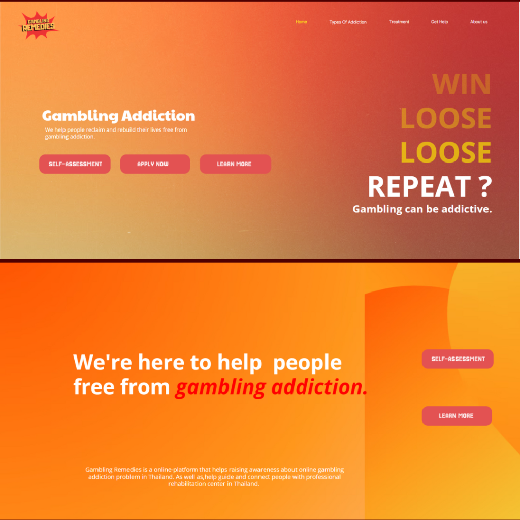 “Gambling Remedies” is an online platform dedicated to raising awareness about the online gambling problem among Thai young adults entering the workforce, by offering features such as online counseling, self-assessment quizzes, and personalized professional rehabilitation center recommendations, through interactive websites and playful design.